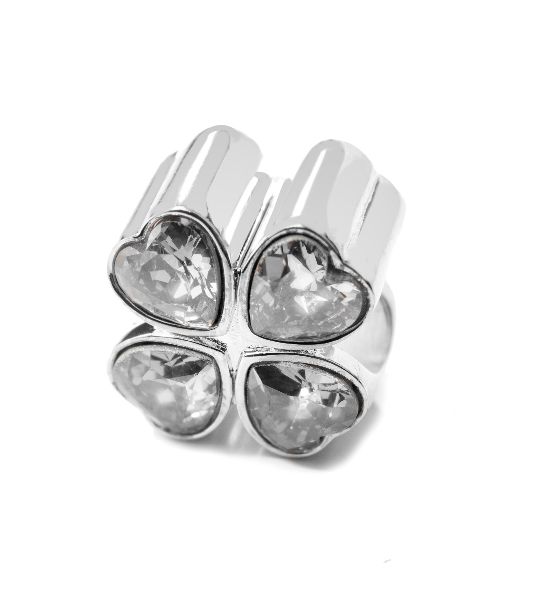 Пръстен с четири сърцевидни кристала, оформени в уникален дизайн. Всеки кристал е внимателно инкрустиран, придавайки блясък и елегантност.