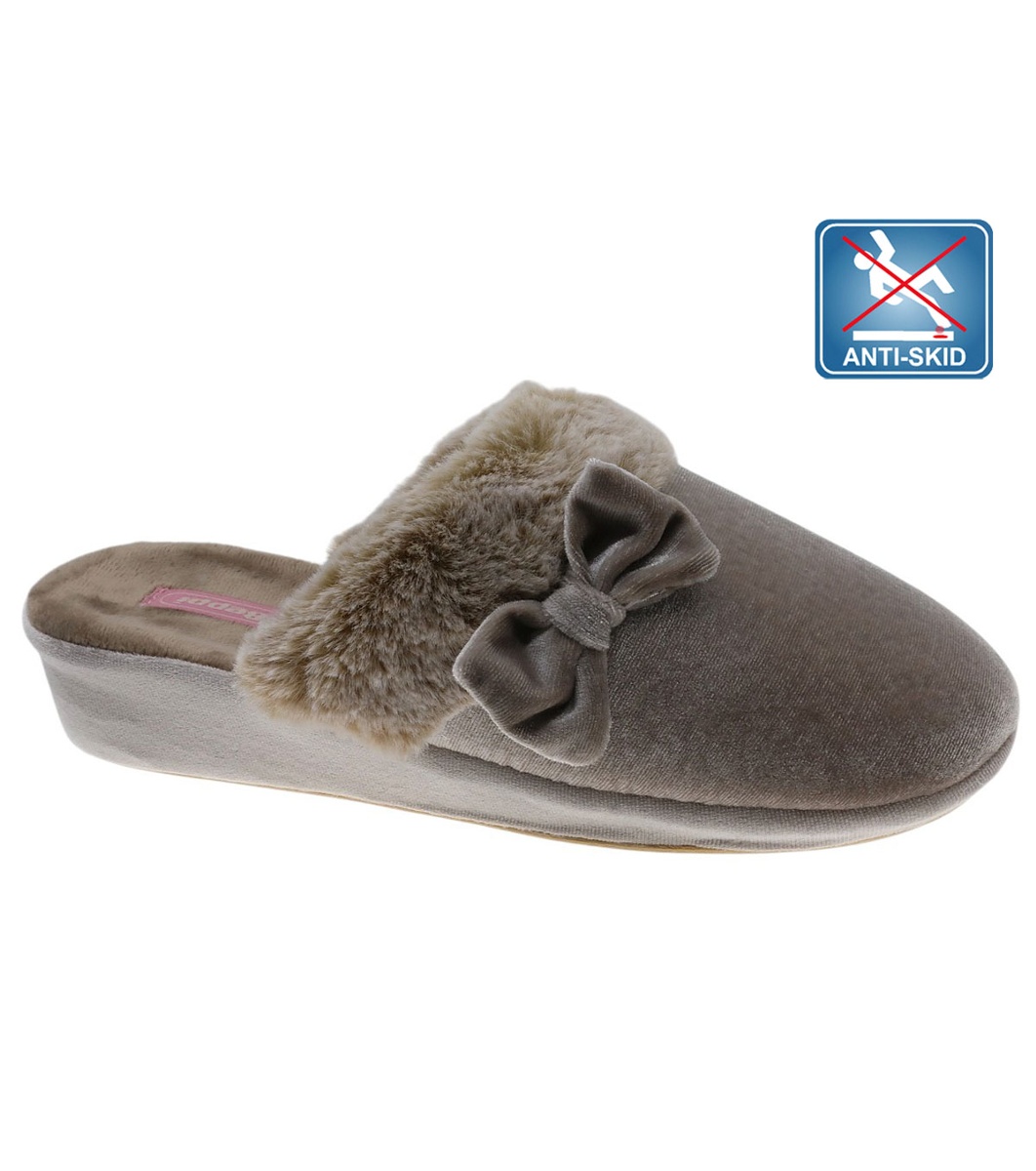 Дамски домашни чехли с отворена пета и леко повдигната подметка.