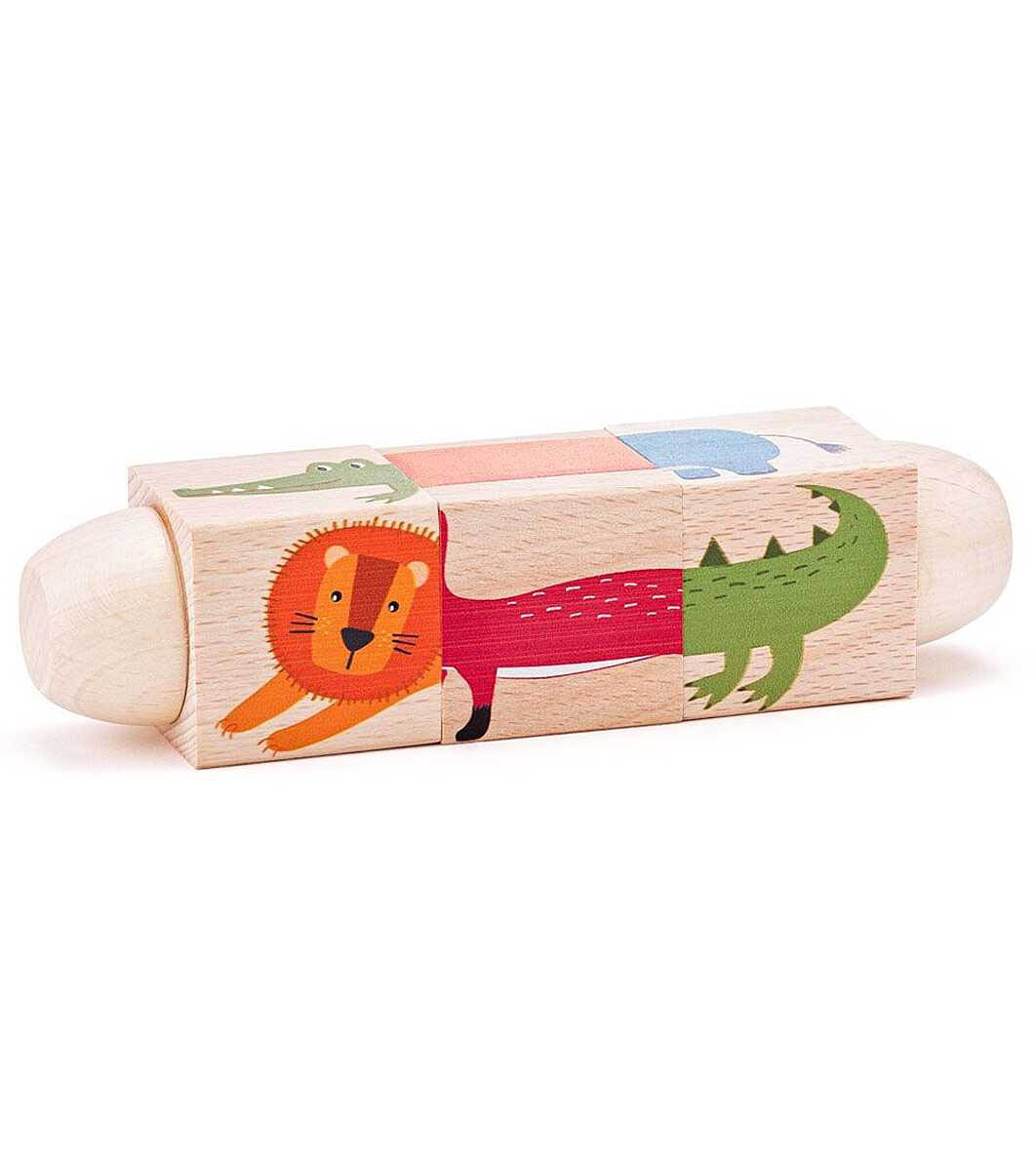 Този симпатичен кубус му дава възможност да завърти трите елемента последователно и да съживи крокодилчето, лисичето, хипопотама и лъва, изрисувани на четирите му страни. Но и дори, когато не успява, може да се порадва на чудатите животни, които се получават от комбинациите. И като един истински откривател да им даде имена.