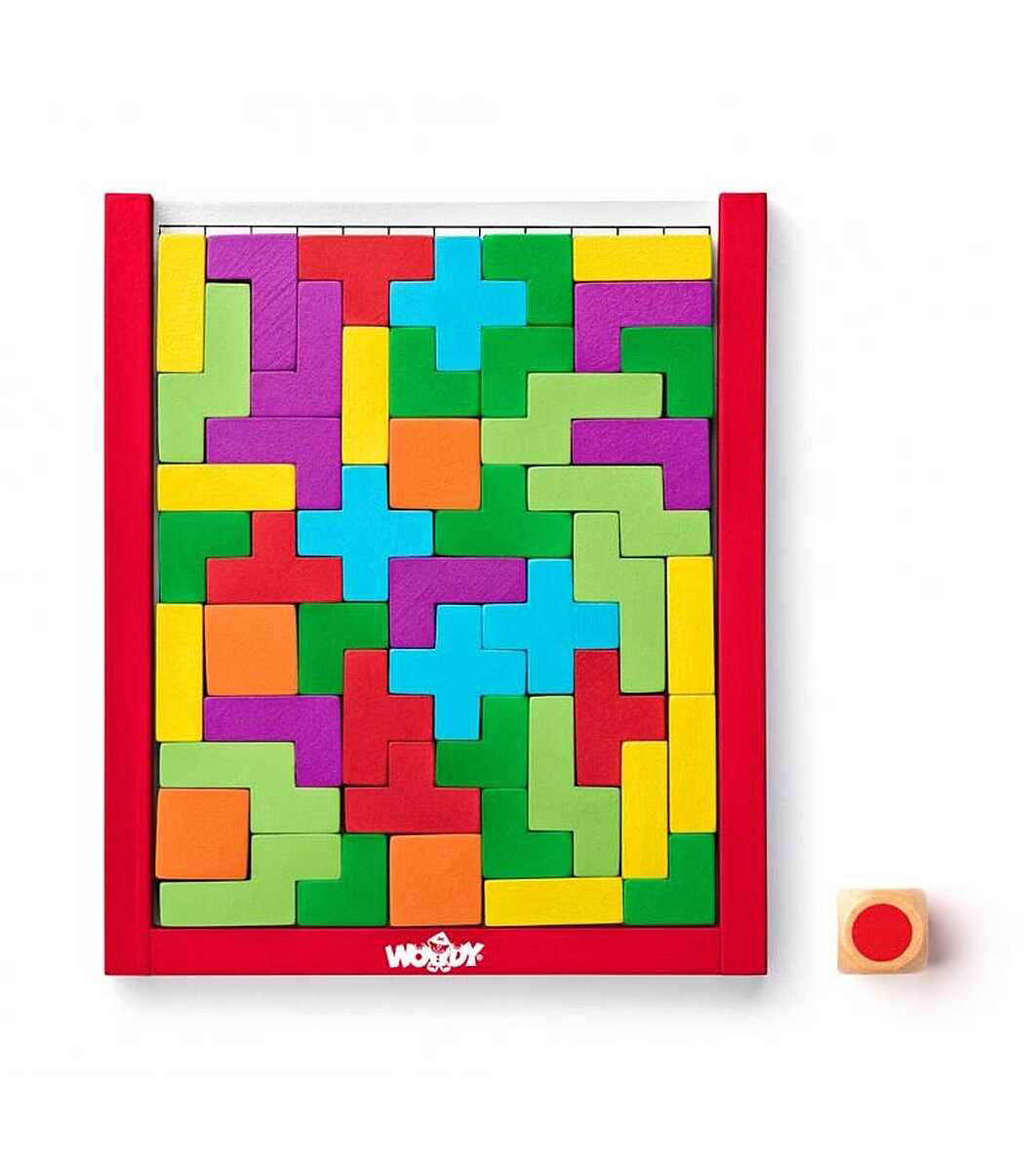 Дървената игра Главоблъсканица на Woodyland може да се играе по много начини. Играта съдържа 48 цветни елемента в различни цветове и форми и зарче с цветове