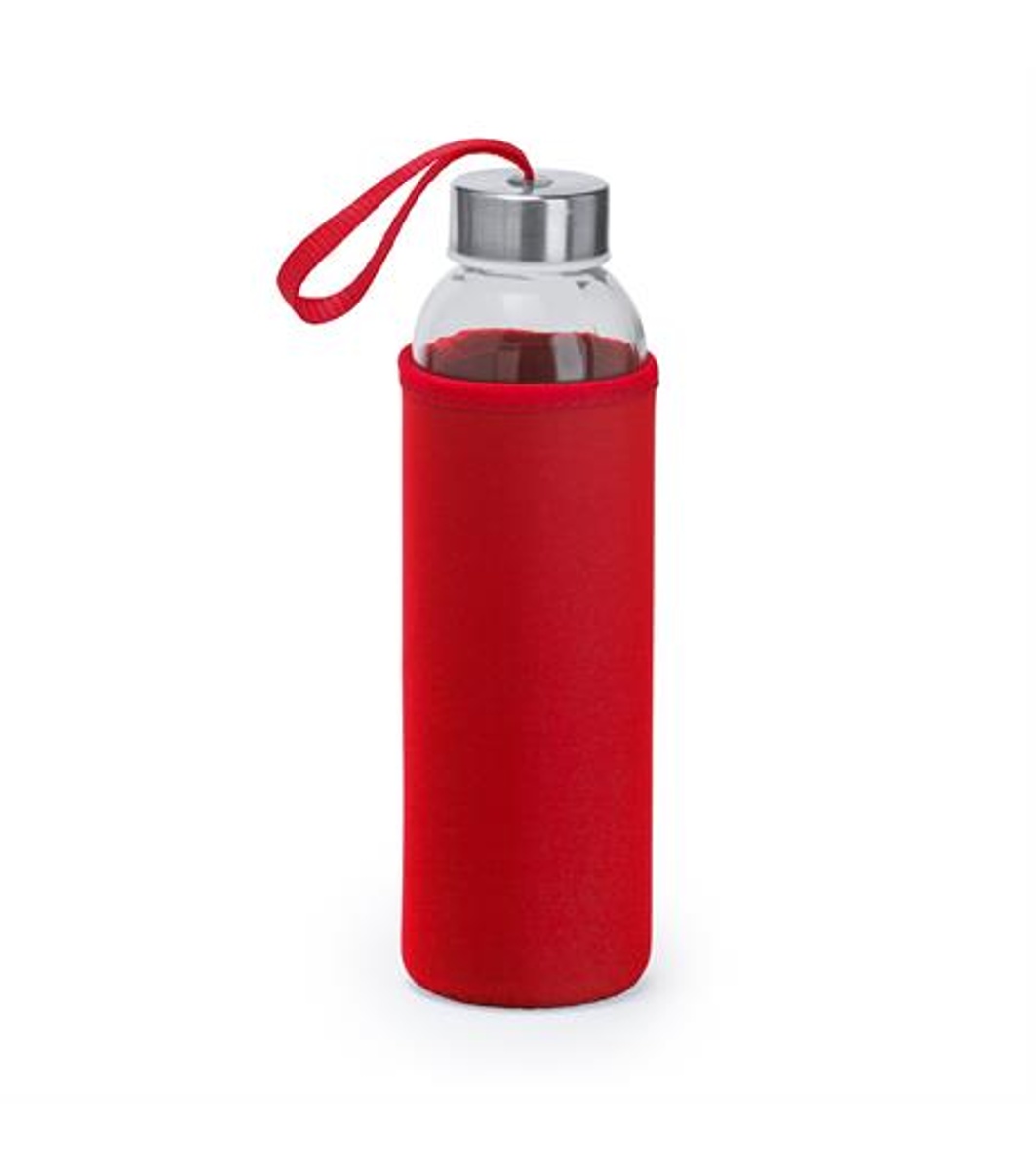 Стъклена бутилка с вместимост 500 мл и корпус от неопрен, комбиниран с цветна каишка за носене.