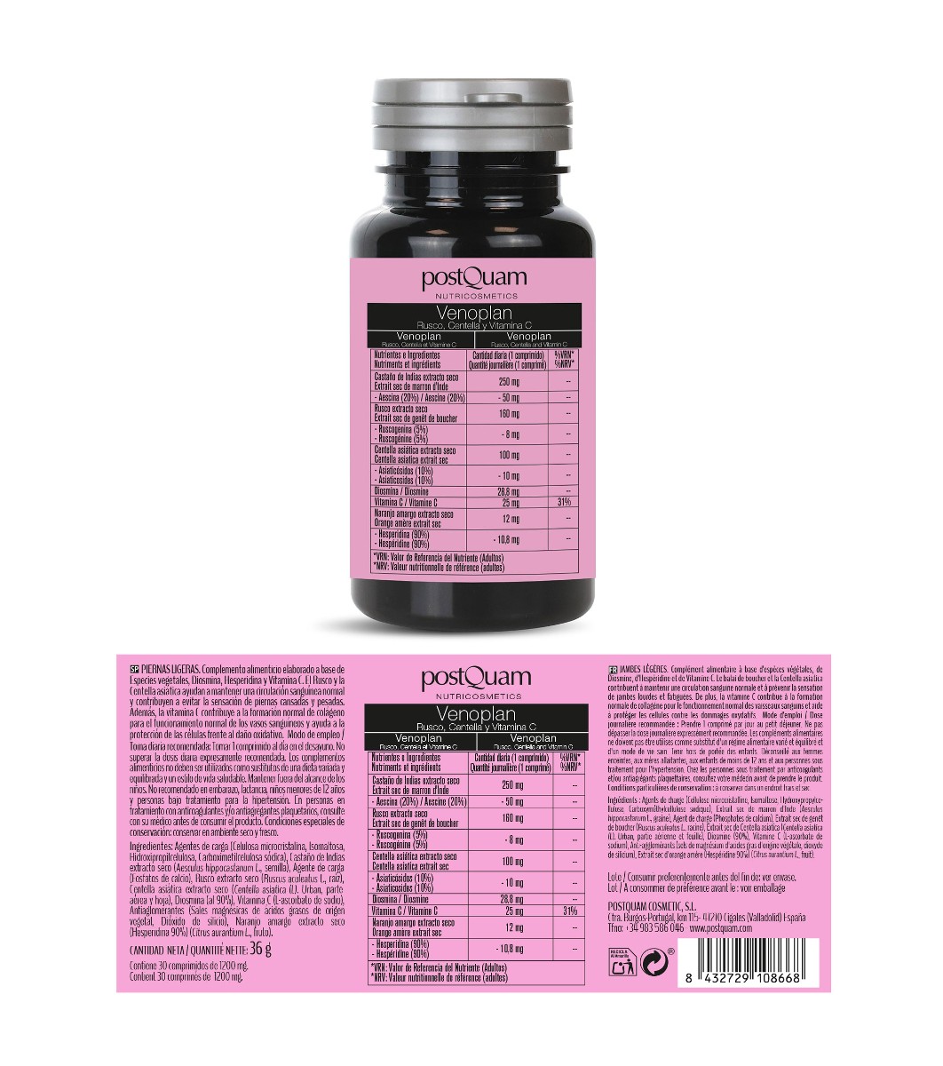 Fillers (Microcrystalline cellulose, Isomaltose, Hydroxypropylcellulose, Sodium carboxymethylcellulose), Horse Chestnut dry extract (Aesculus hippocastanum L., seed), Filler (Calcium phosphates), Butcher's Broom dry extract (Ruscus aculeatus L., root), Gotu Kola dry extract (Centella asiatica (L.) Urban, aerial part and leaf), Diosmin (90%), Vitamin C (Sodium L-ascorbate), Anti-caking agents (Magnesium salts of fatty acids of vegetable origin, Silicon dioxide), Bitter Orange dry extract (Hesperidin 90%) (Citrus aurantium L., fruit).